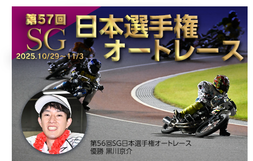 【今開催は日中開催・通常マフラー・6日間開催です】 ■開門 10:00■1R試走開始 10:15 [NEW] 展望記事オートーーク 優勝候補は?注目選手は!? ☆レース場ファンサービス・イベント情報 ◇今開催ロッカーレポート内容について 現地レポート 青山記者・まっすぅによる現地レポートをお届け! 3日目 「全国屈指の雨巧者が真っ向勝負でNo.1の連勝を止める!」 『今日のピックアップ選手』 2日目 「No.1は絶大なる支持に応えて自身9回目の10連勝達成!」 『今日のピックアップ選手』 初日 「No.1はしっかり勝ちきり自身9度目の10連勝に王手!」 『今日のピックアップ選手』 前検日 「前回大会覇者は不在も各地から豪華メンバー集結!」 『今日のピックアップ選手』 その他レース情報 日本選手権オートレースとは? SG第57回日本選手権オートレース出場選手 出場選手変更について 各SGレース優勝戦成績 スーパースターへの道2025