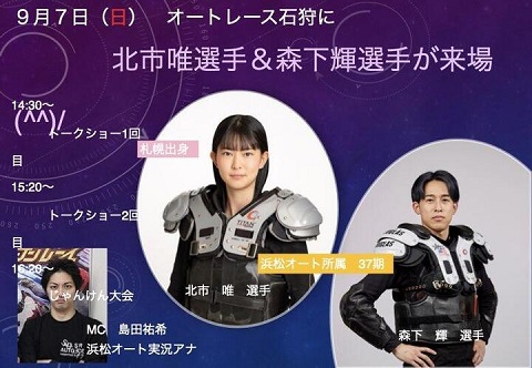 9/7(日)に、オートレース石狩にて、北市唯選手と森下輝選手のトークショーが開催されます!(MC島田祐希さん)