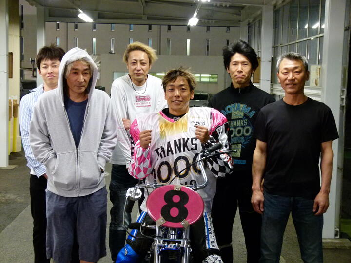 1,000勝を達成した青山周平選手と師匠の仲口武志選手(左)、後列左から木村享平選手、亀井政和選手、大月渉選手、千葉泰将選手