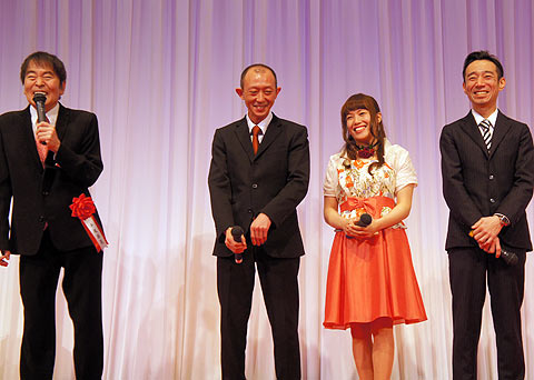 ステージには乾杯後、佐藤摩弥選手と平尾昌晃さんはそのままステージ上に残ると、更に若井友和選手と永井大介選手が登場!