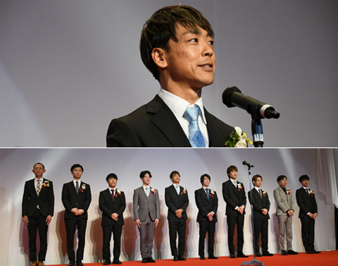 全ての表彰、インタビューが終わると再び表彰選手が壇上に揃い、代表して青山周平選手よりあいさつ。